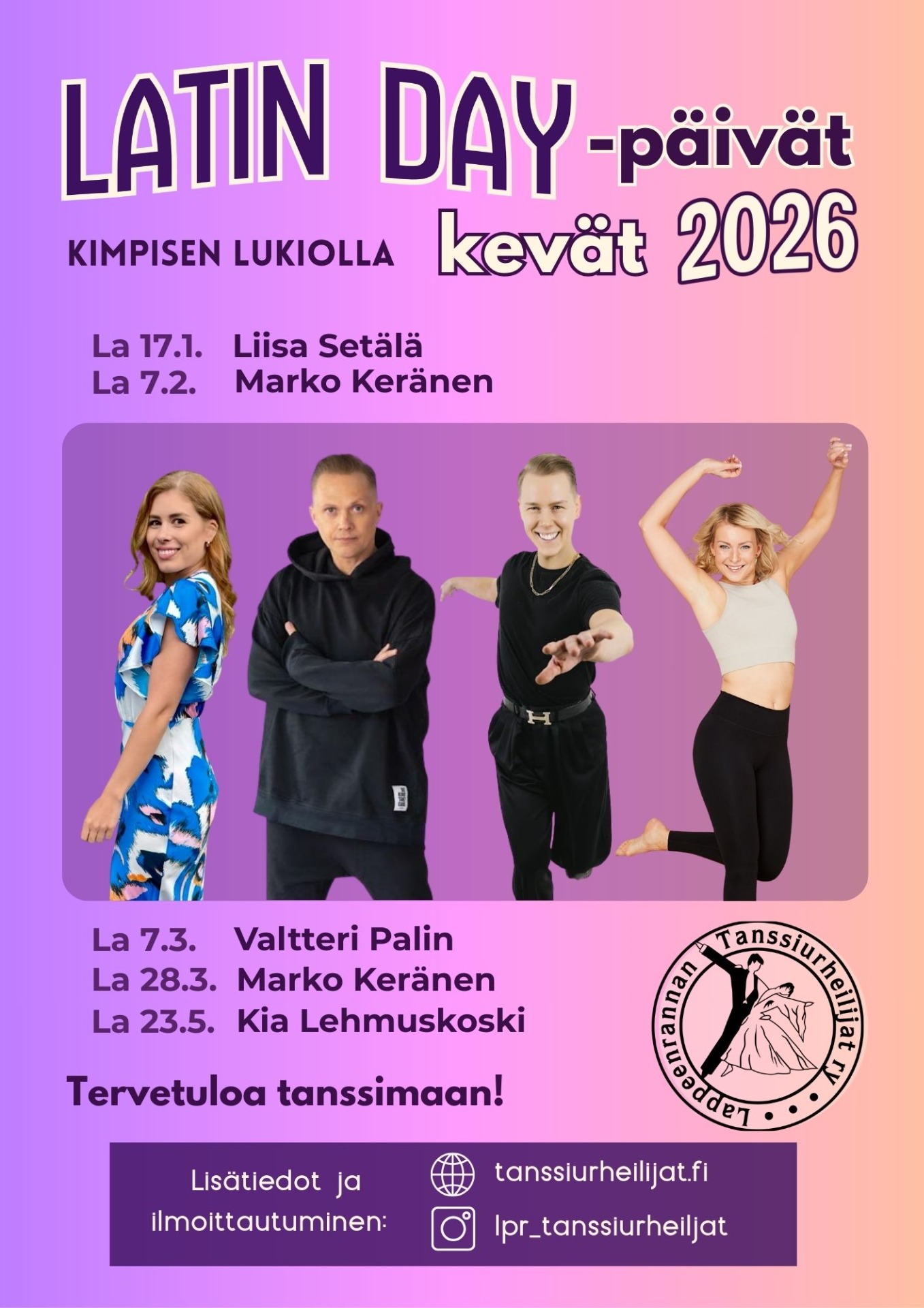 Näin vuoden 2025 lopussa on aika julkaista kevään 2026 Latin Day -päivien päivämäärät ja opettajat! Tulevana keväänä tanssitaan jopa viisi kertaa Kimpisen lukiolla!
