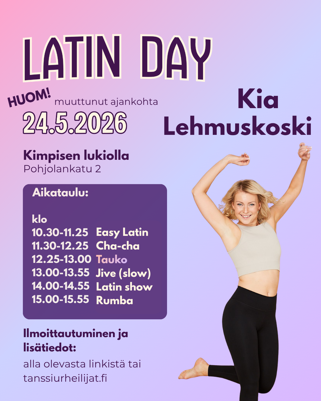 Kevään viimeinen Latin Day tanssitaan Kia Lehmuskosken kanssa sunnuntaina 24.5.2026! Huom. muuttunut pvm!